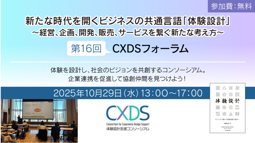 - 第16回 CXDSフォーラムのご案内世界に挑むためのビジネスの共通言語「体験設計」 ~経営、企画、開発、販売、サービスを繋ぐ新たな考え方~ 第16回 2025年度CXDSフォーラム 企業が次のステージへ挑戦するためには、経営・企画・… 続きを読む: 第16回 CXDSフォーラムのご案内