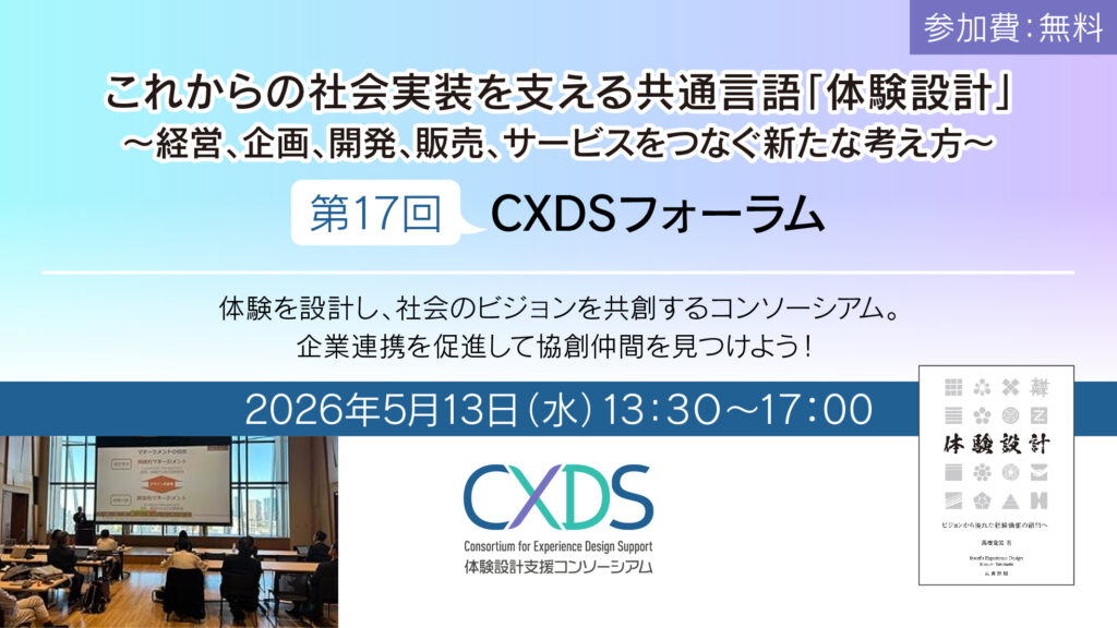 - 第17回 CXDSフォーラムのご案内これからの社会実装を支える共通言語「体験設計」 ~経営・企画・開発・販売・サービスをつなぐ新しい考え方~ 第17回 2026年度CXDSフォーラム 企業が次のステージへ挑戦するためには、経営・企画… 続きを読む: 第17回 CXDSフォーラムのご案内