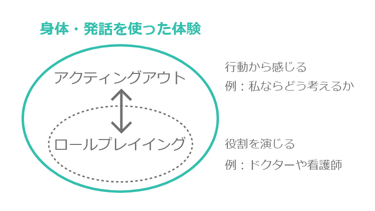 アクティングアウトをおこなうことで意識できていなかった物理的・⾝体的な関係を発⾒できるだけでなく、実際に演じることによって意味的・感情的な発⾒ができます。