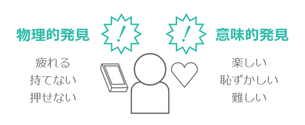 物理的・⾝体的な発⾒としては、そもそも物理的に無理である、⾝体的に出来ない疲れるなど安全性や効率性を確認することができます。意味的・感情的なものとしては⼈前でやるのが恥ずかしい、達成感が感じられないなどの気持ちを確認することができます。