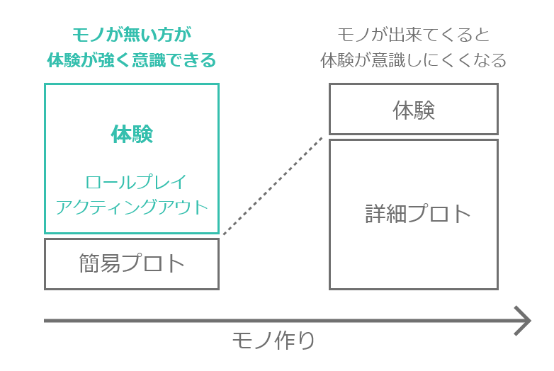 たとえば機能しないプロトタイプ(空き箱など)をあえて使うことによって「それが実際はどんなモノでこのシーンにおいてどんな役割をもっているのか」という最⼩限で本質的なこと明確にする必要が出てくるため、結果的にそれを意識したアクティングアウト(疑似体験)をおこなうことができるからです。