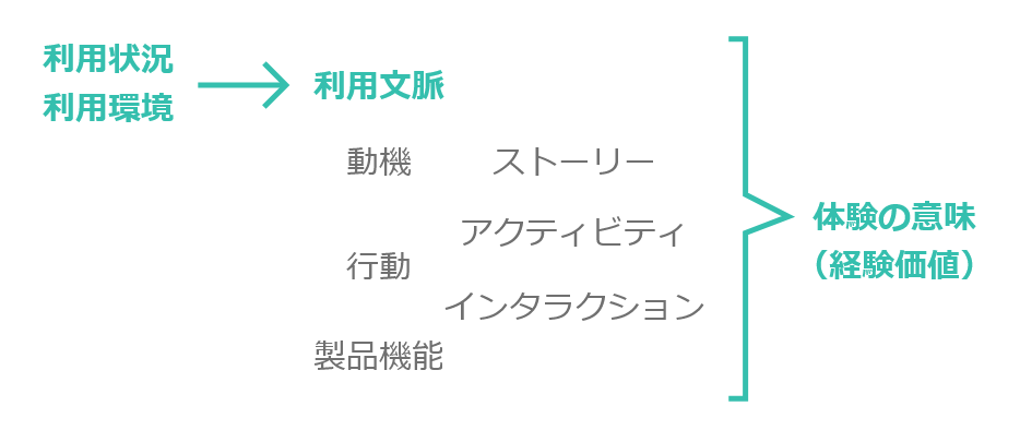 利⽤⽂脈は、環境やそこでの活動が情報となり「動機」が⽣まれ「⾏動」が引き起こされ「結果」が⽣じます。その結果が次の動機へと繋がり⼀つの価値を持つ出来事として形成されます。