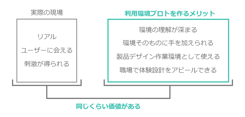 ユーザー観察と同じように、実際の現場に⾏くことはインプットとして重要です。その場所が⽇常的にいくことができプロトタイピングに使えるのであれば活⽤しない⼿はありません。