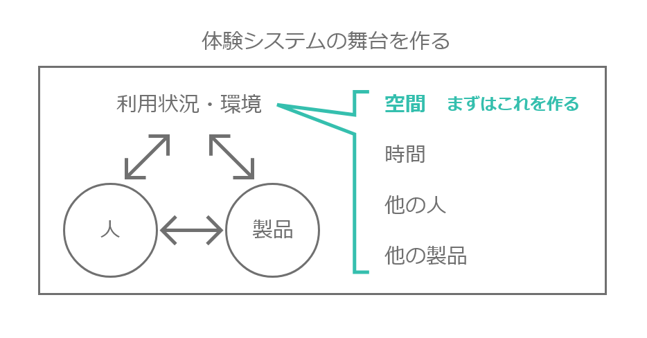 個々の機能や⾏動から体験が作られるのではなく、⽂脈によって繋がった出来事によって意味が作られ体験価値として意識されます。そのため体験設計のプロトタイピングでは利⽤環境などの製品周辺を⼤切にしなければならないのです。