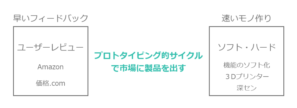 ソフトウェアが製品機能の主要なものになってきている現在では、カメラや⾃動⾞などでもソフトウェアのアップデートによって短期間での改善をおこなうことができるようになっています。またハードウェアでも3Dプリンターの活⽤や中国・深センでのモノ作りエコシステムを活⽤することで短期間に改善を繰り返すことができるようになってきています。