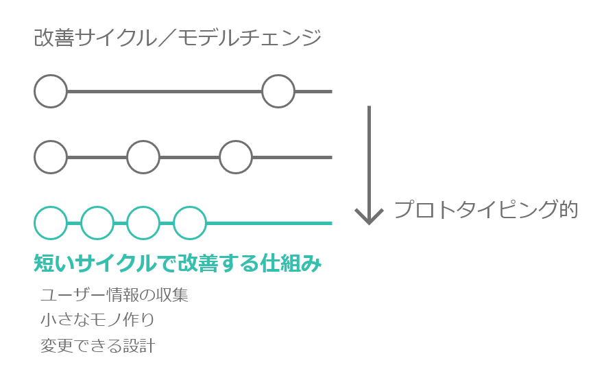 体験は最終的にユーザーによって⾏われるため企業内のプロトタイピングでは分からないことも多くあります。そのため早く市場に出してフィードバックを得て改善していく⽅法をとることは有効な手段の一つです。